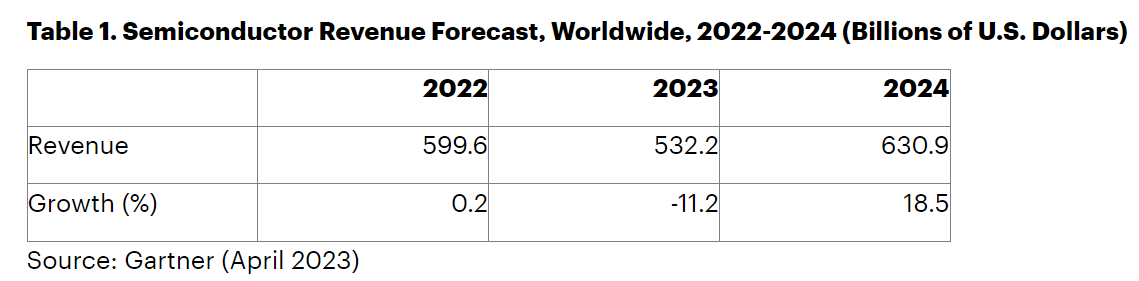 根据Gartner的最新预测,2023年全球半导体收入预计将下降11.2%。2022年,市场总额为5996亿美元,比2021年增长0.2%。