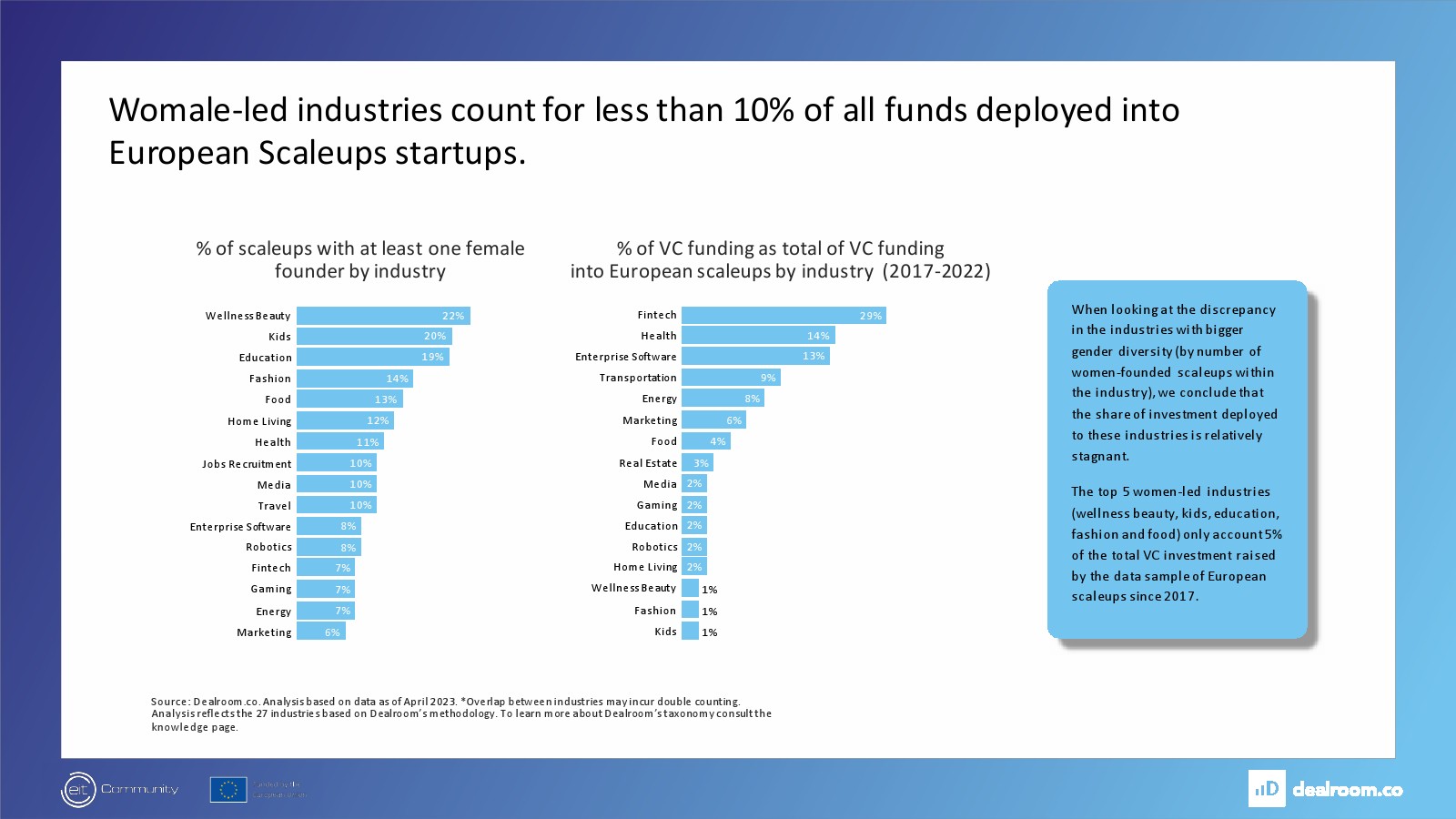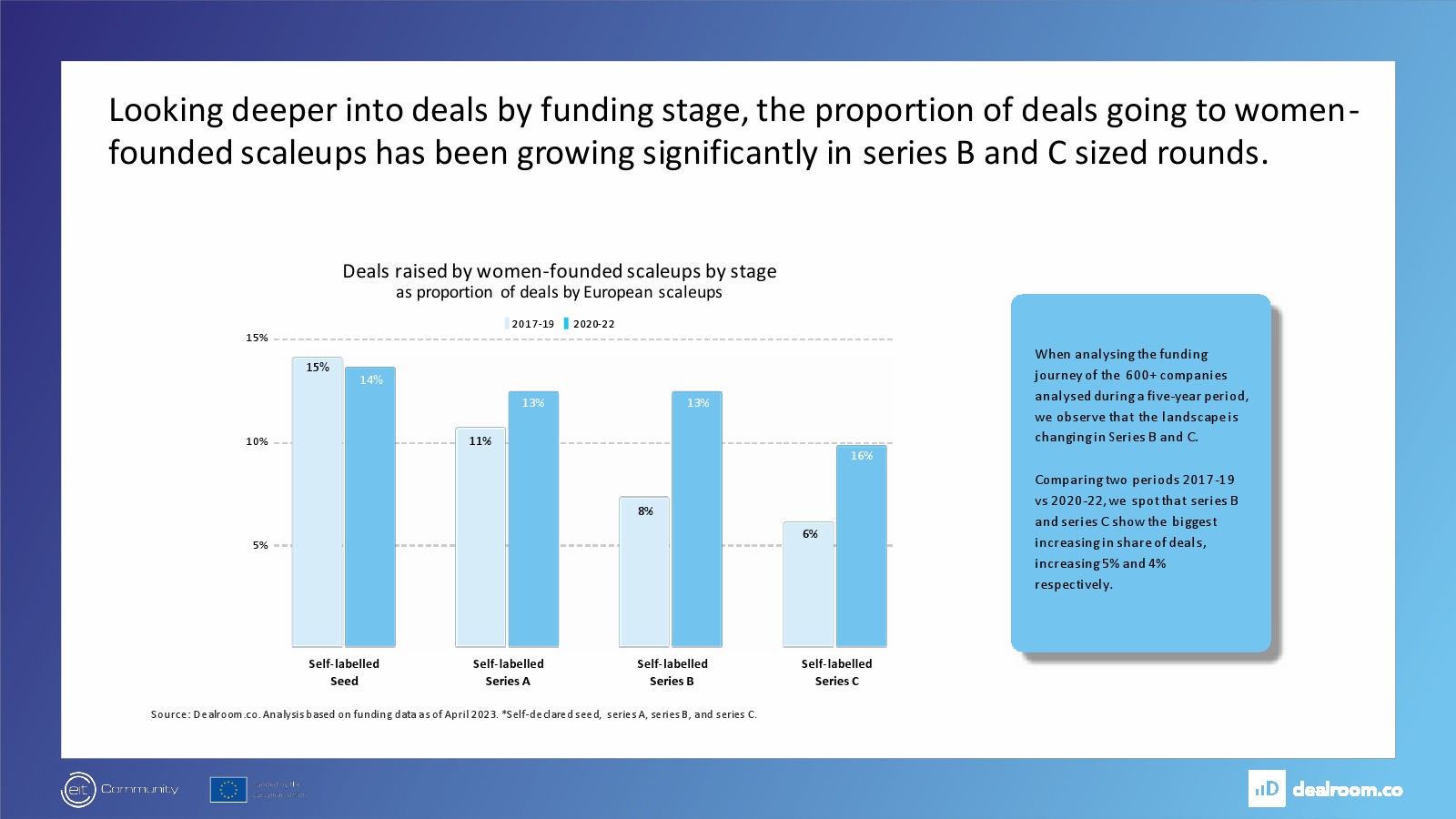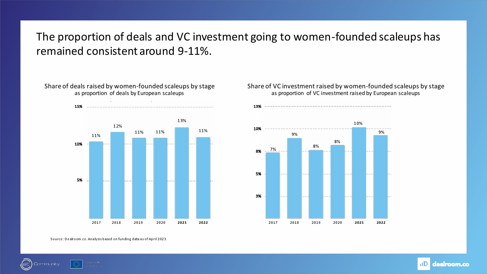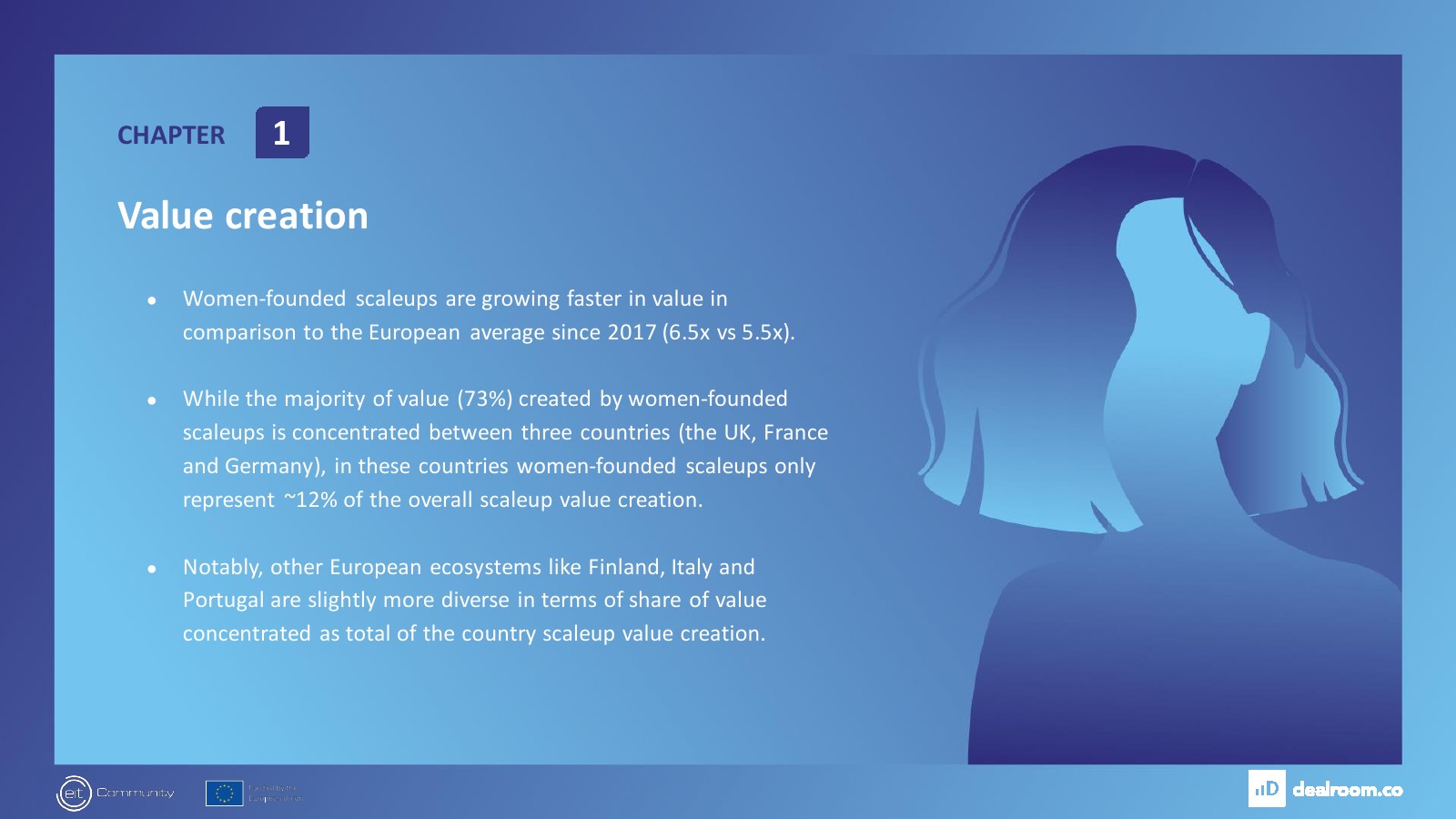 Dealroom发布了“女性创始人和投资者报告”。自2017年以来,由女性创办的企业价值增长速度快于欧洲整体企业价值(6.5倍 vs 5.5倍)。