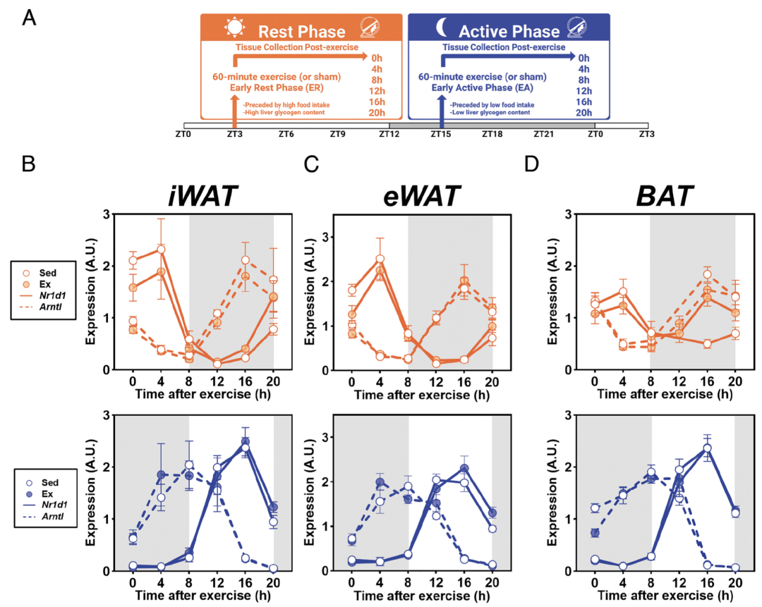 结果显示,无论是早上或晚上运动,在运动后的0-20小时内,iWAT和eWAT的生物钟基因转录物均彰显出节律性表达,且振幅和周期不受到运动时间的干扰;而在BAT中,无论运动还是静止,Arntl和Nr1d1基因的节律性均不显著。