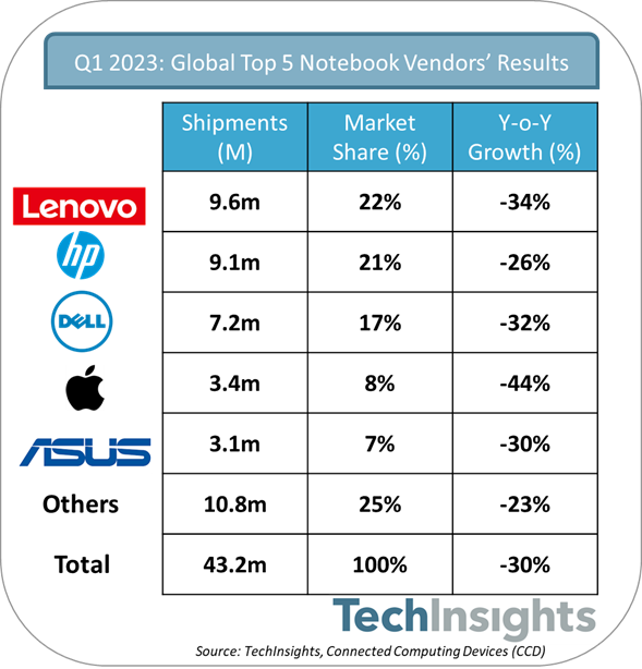 TechInsights指出,宏观经济环境恶化和笔记本电脑需求持续放缓导致全球笔记本电脑出货量在2023年Q1下降了30%。2023年Q1笔记本电脑出货量为4320万台,是自2020年Q1全球新冠疫情开始以来最低出货量。
