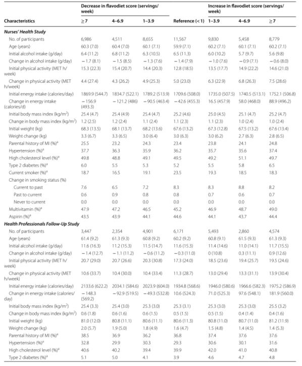 在随访期间,大多数的参与者增加了富含类黄酮的食物的摄入量,所有参与者的体重都有增加的趋势,但那些富含类黄酮的食物摄入量增加最多的人似乎更健康,因为与减少富含类黄酮的食物摄入的参与者相比,他们的体重增加较少,能量摄入和体力活动增加较多。