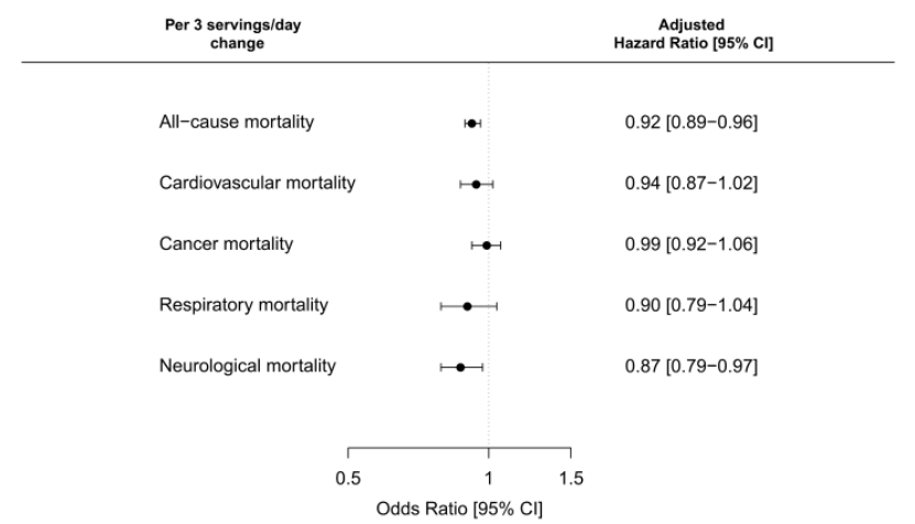 图3. 全因死亡率(风险比,95%置信区间)与摄入富含类黄酮食物8年变化之间的关系。图片来源:doi: 10.1186/s12916-023-02873-z.