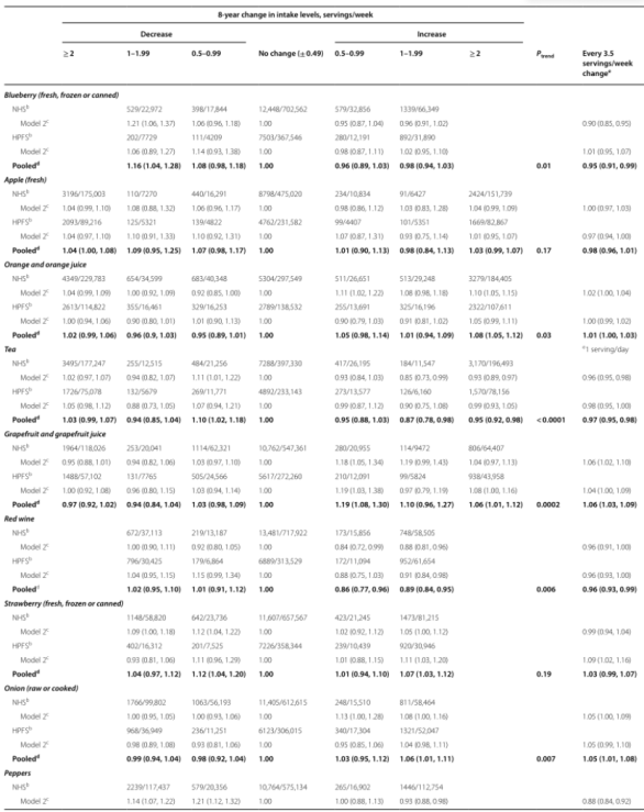 这项研究记录了1986年至2018年间NHS的15293例死亡和HPFS的8988例死亡。在综合多变量调整分析中,与摄入量保持相对稳定的参与者相比,茶、红酒和辣椒摄入量增加最多的参与者的总死亡率分别降低了5%、11%和6%。此外,当建模为连续变量时,每天增加1份茶的摄入量与全因死亡率降低3%相关,每隔一天增加1份红酒、辣椒和蓝莓的摄入量分别与全因死亡率降低4%、9%和5%相关。