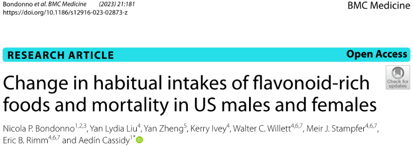 [1] Bondonno NP, Liu YL, Zheng Y, Ivey K, Willett WC, Stampfer MJ, Rimm EB, Cassidy A. Change in habitual intakes of flavonoid-rich foods and mortality in US males and females. BMC Med. 2023 May 12;21(1):181. doi: 10.1186/s12916-023-02873-z.