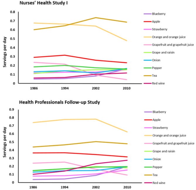 随着时间的推移,研究对象对大多数富含类黄酮的食物的平均摄入量保持稳定,而蓝莓、茶和红酒的摄入量在两个队列(NHS和HPFS)中都有增加的趋势,柑橘类水果(橙子和葡萄柚)及其果汁的摄入量有减少的趋势。
