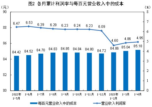 1—4月份,规模以上工业企业每百元营业收入中的成本为85.18元,同比增加0.91元;每百元营业收入中的费用为8.40元,同比增加0.31元。