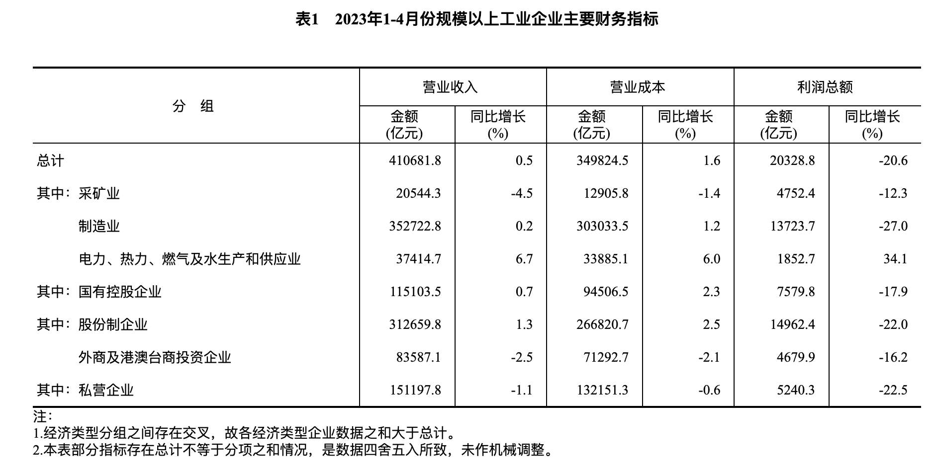 1—4月份,全国规模以上工业企业实现利润总额20328.8亿元,同比下降20.6%(按可比口径计算,详见附注二)。