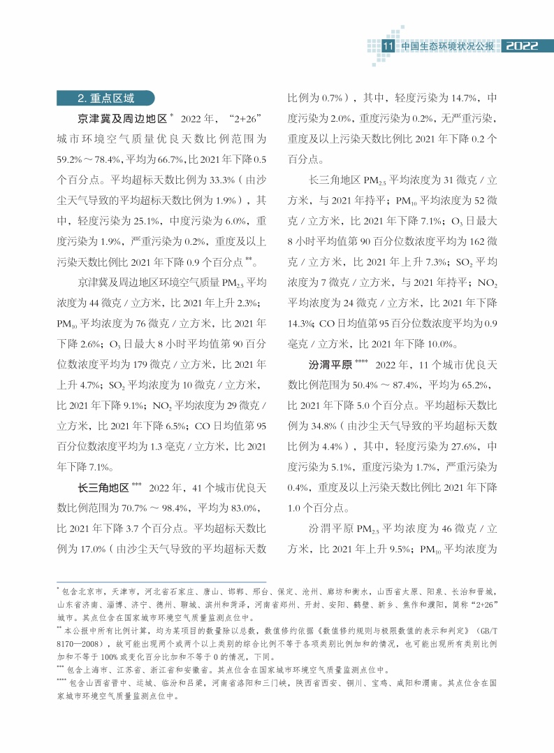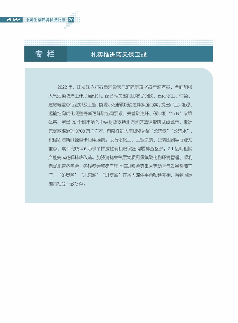 生态环境部发布的《2022中国生态环境状况公报》从大气、水环境、海洋生态、土地生态、自然生态、声环境、辐射环境、气候变化与自然灾害以及其他等九个方面对生态环境状况进行了全面的梳理总结。