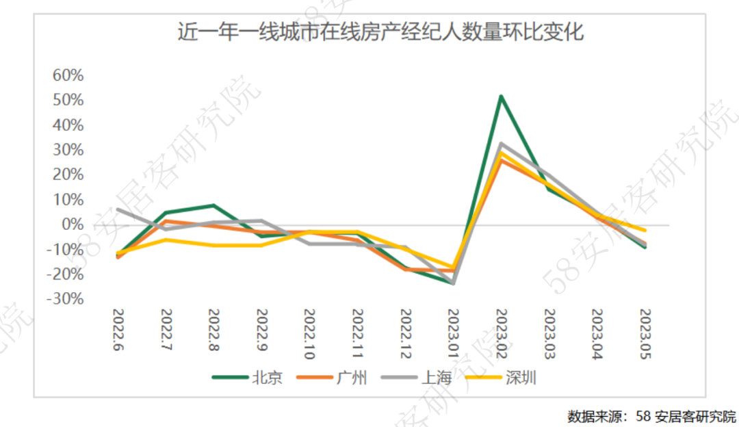 四个一线城市房产经纪人数量环比均明显减少,主要是由于一线城市五一假期出行人数多,看房热情下降,作业经纪人也随之减少。也可以看到,一线经纪公司的招兵买马已经进入尾声,经营回归常态化,后续人数的变化将更大程度上依赖于市场的变化。