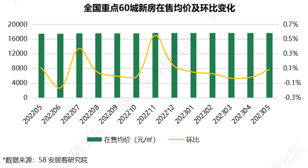 5月60个重点城市新房在售均价17726元/㎡,环比微涨0.08%,表现相对平稳。其中24城新房在售均价环比上涨,29城房价环比下跌。