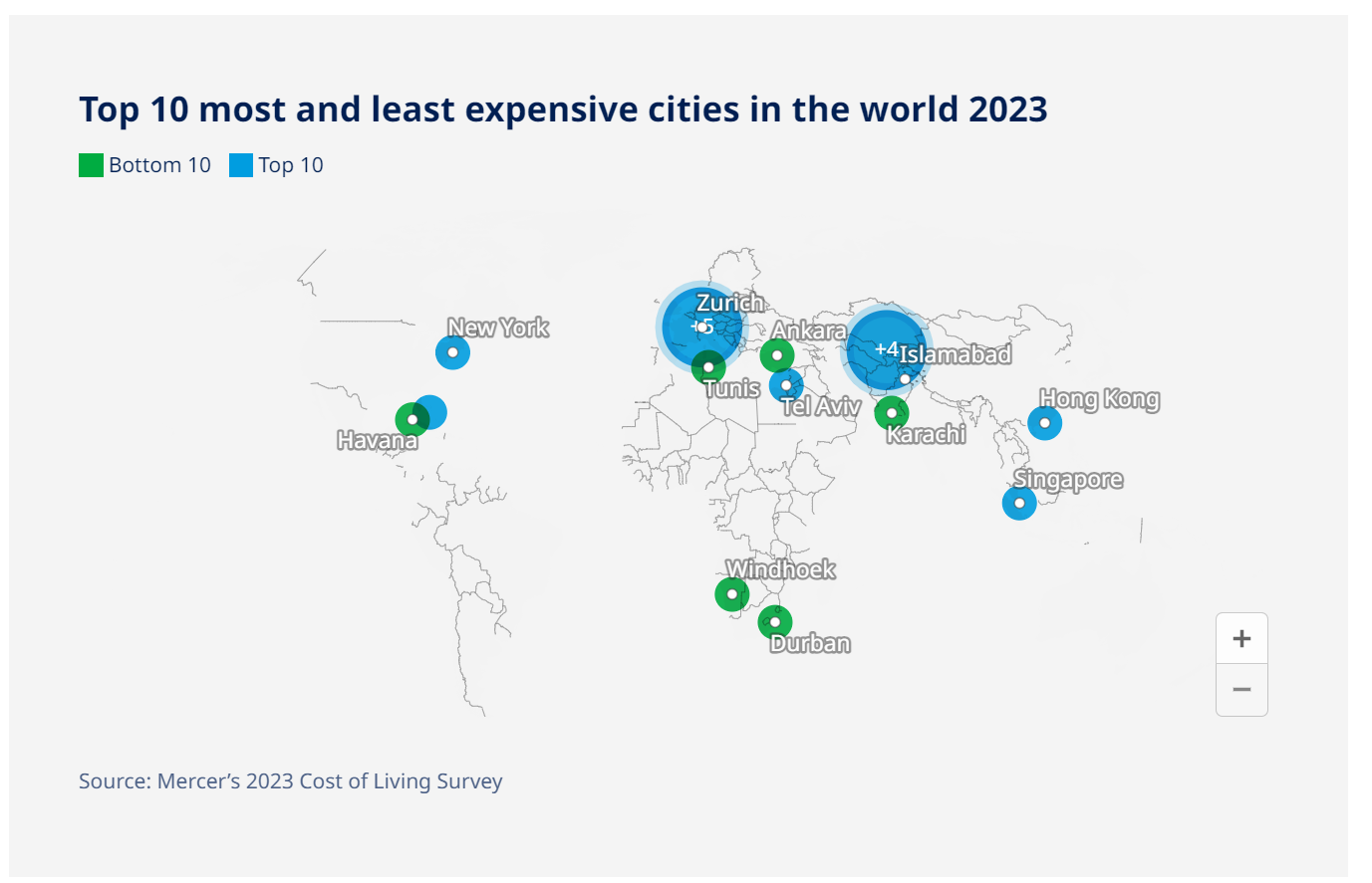 全球前十名包括五个欧洲城市,其中四个在瑞士,第五个是哥本哈根。该地区其他生活成本最高的城市包括伦敦、维也纳、阿姆斯特丹、布拉格(自去年以来在全球排名上升了27位)和赫尔辛基。