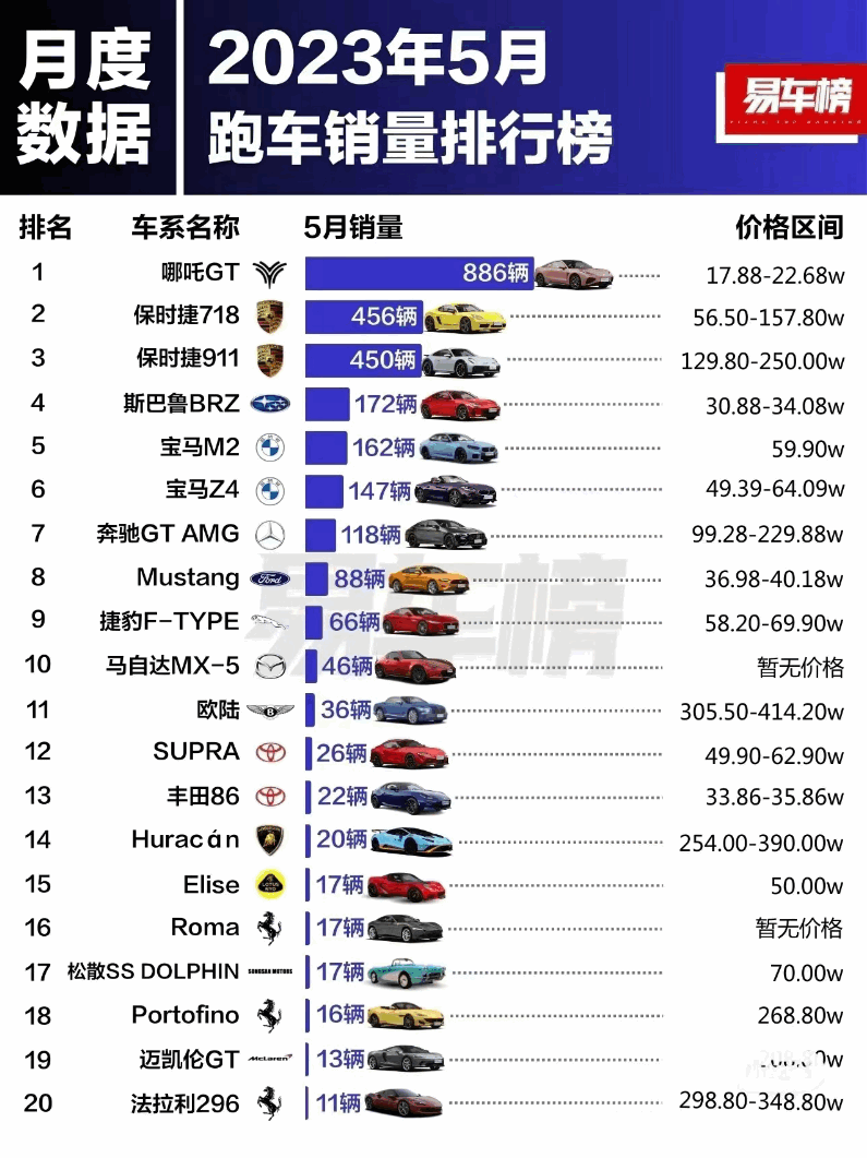 哪吒GT在5月份卖出了886辆,远远领先保时捷718和保时捷911等跑车。并且,哪吒GT和保时捷这两款车,包揽了5月份跑车销量前三甲。