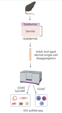 为探究衰老的皮肤与年轻皮肤细胞构成及基因表达的不同之处,研究人员通过单细胞RNA测序(scRNA-Seq)分析了小鼠背部皮肤非上皮细胞(EpCAM-)的基因表达情况,并将年龄在80-90周的老年小鼠与年龄在17-25周的成年小鼠的数据进行对比。基于细胞表面是否表达CD45,他们将检测的细胞分为非免疫细胞(CD45-)和免疫细胞(CD45+)两大类。