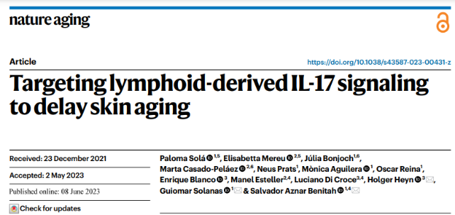【2】 Solá, P., Mereu, E., Bonjoch, J. et al. Targeting lymphoid-derived IL-17 signaling to delay skin aging. Nat Aging (2023). https://doi.org/10.1038/s43587-023-00431-z