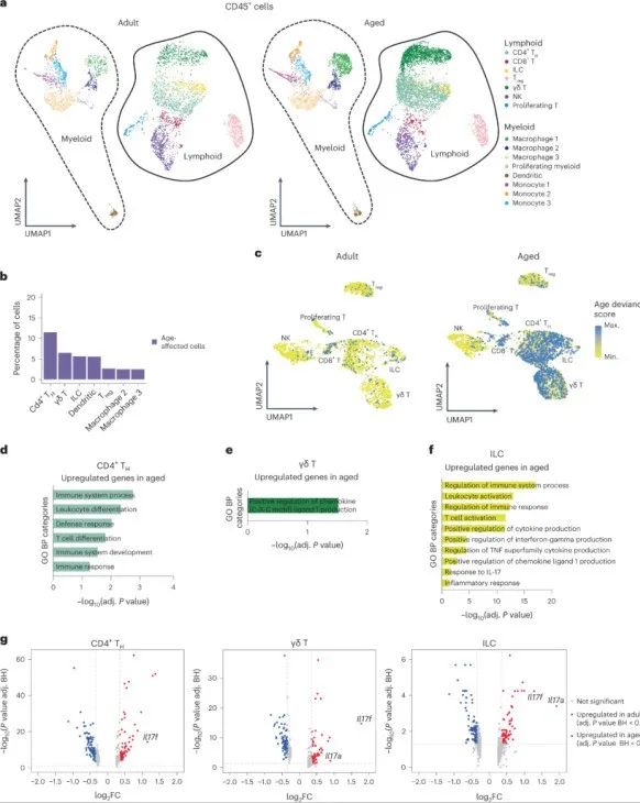 由于在非免疫细胞中未检测到衰老相关生物标志物转录水平和蛋白表达水平的变化,研究人员主要聚焦免疫细胞,特别呈显著年龄相关变化的CD4+TH 细胞, γδ T 细胞和先天性淋巴细胞等淋巴细胞。与成年小鼠相比,这些淋巴细胞的占比在老年小鼠中显著增高。