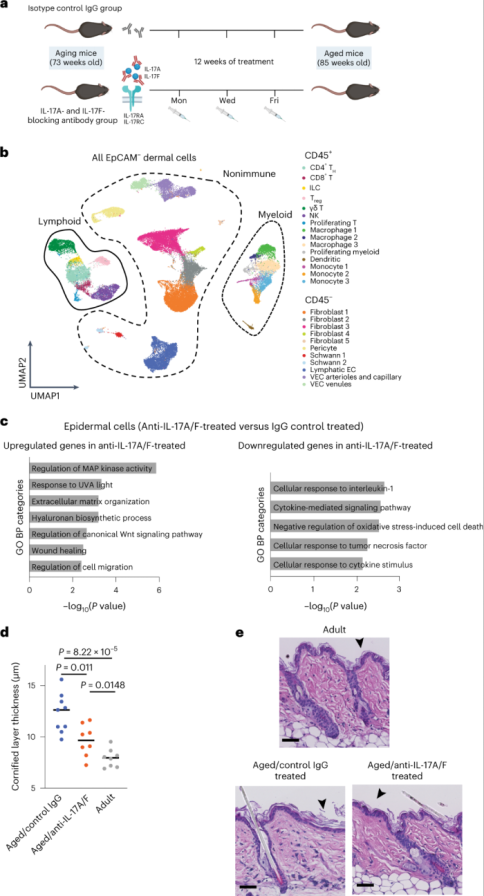 为研究IL-17A/F的上调是否会通过促进炎症状态进而导致皮肤衰老,研究人员利用IL-17A和IL-17F的抗体来处理老年小鼠。处理12周后,他们发现老年小鼠皮肤的炎症水平显著下降。他们还测量了小鼠的角化层厚度以评估皮肤衰老层度。结果表明抑制IL-17A/F可以降低角化层厚度,让皮肤状态变得更年轻。