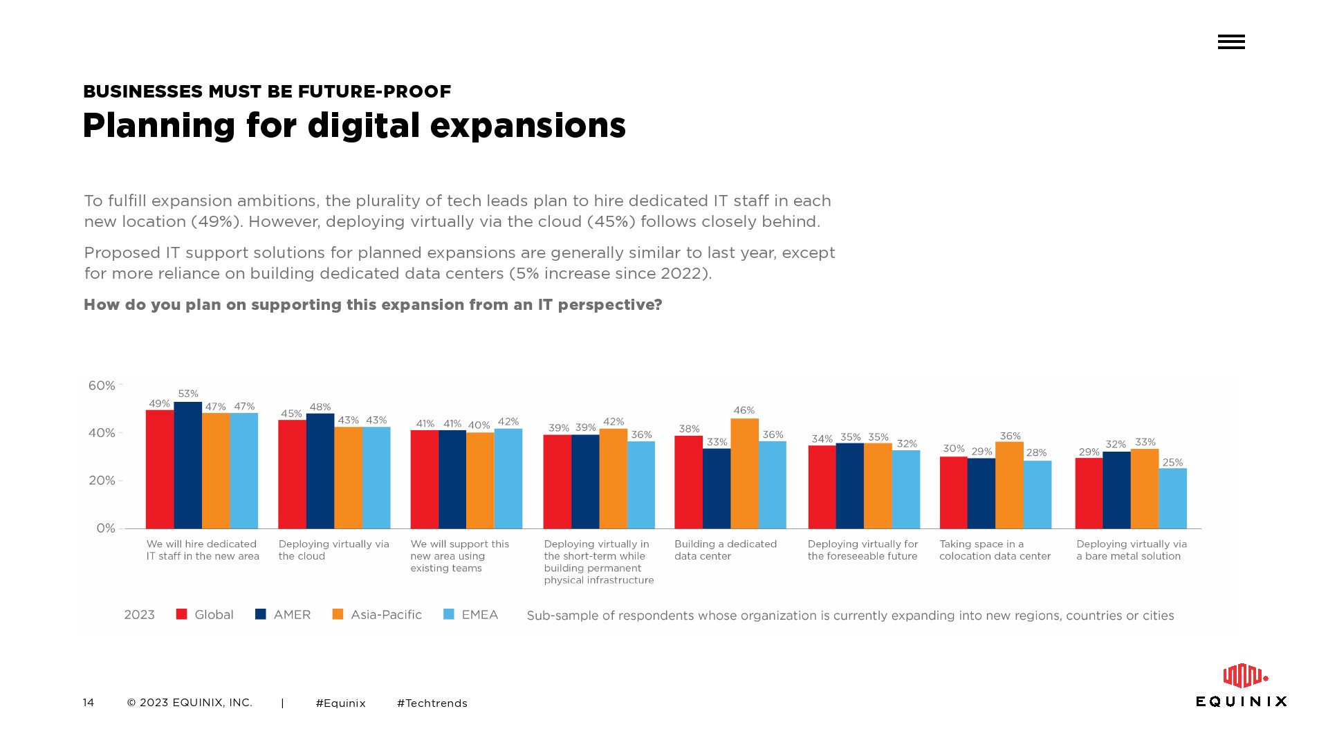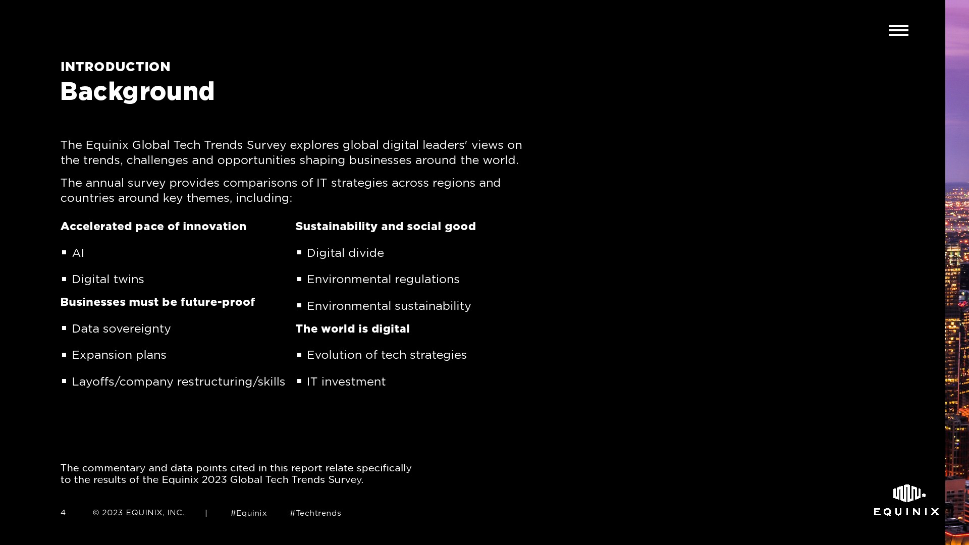 Equinix全球技术趋势调查旨在探讨全球数字领导者对影响全球业务的趋势、挑战和机遇的看法。这项年度调查提供了各地区和国家围绕关键主题的IT战略比较,包括: