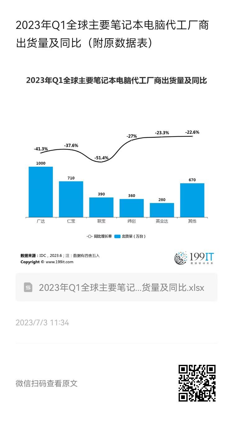 - 2023年Q1全球主要笔记本电脑代工厂商出货量市场份额(附原数据表)