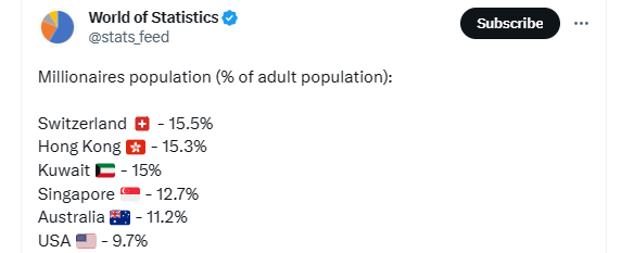 全球范围内,哪些国家或地区的富翁占比更高?数据统计网站World of Statistics本月稍早时(7月5日)公布了一份“各地百万富翁人口占成年人口比例”的统计名单。名单显示,瑞士的百万美元富翁占当地成年人口的15.5%,该比例高居世界第一;中国香港地区以15.3%的水平排名第二;科威特则位列第三,百万富翁占比15%。