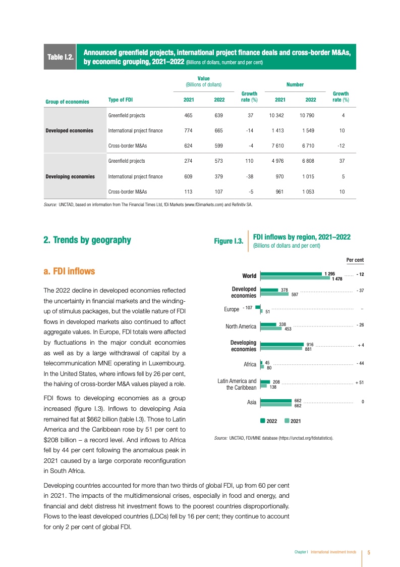从地区来看,2022年亚洲发展中国家的外国直接投资保持平稳,为6620亿美元,约占全球流入量的一半。但这些流入的资金高度集中,五个经济体(依次为中国、新加坡、香港(中国)、印度和阿联酋)几乎占了该地区外国直接投资的80%。