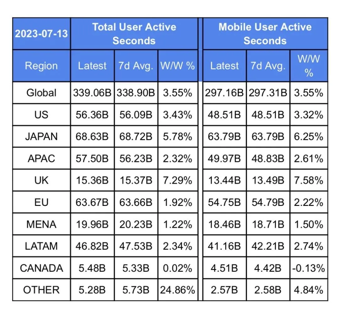 也是在14日,马斯克发推表示:“看起来,本平台可能会出现历史最高的秒使用量(Seconds usage)。”没过多久,马斯克贴出一张图并表示:平台使用周环比增长3.5%。