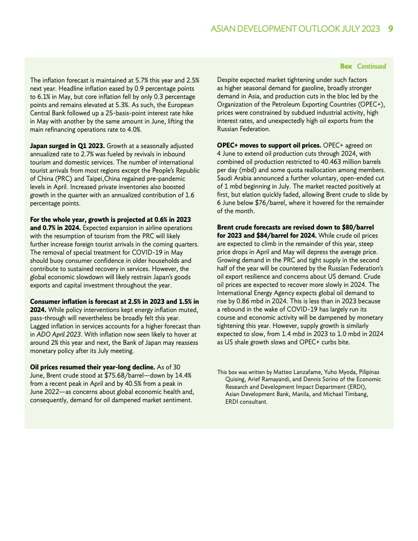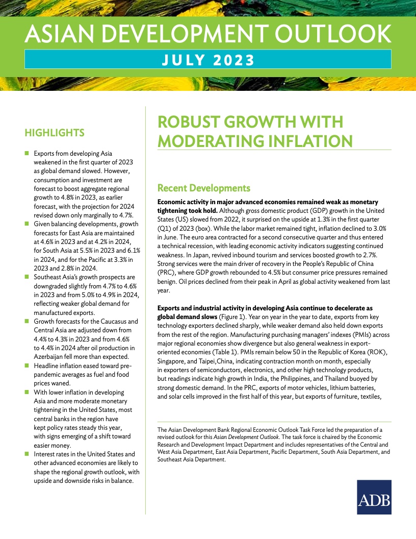 根据今日发布的《2023年亚洲发展展望(七月版)》,通货膨胀率预计将随着燃料和粮食价格的走低而继续下降,逐渐接近疫情前水平。报告预测,亚洲发展中经济体今年的通胀率为3.6%,而4月份预测值为4.2%。与此同时,2024年通胀前景从此前3.3%的估计值上调至3.4%。