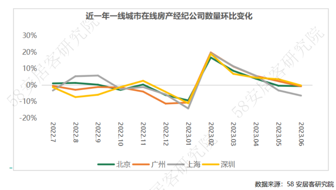 四个一线城市的在线经纪门店也开始走出减少趋势,北京环比小幅下跌,广州和深圳环比减幅约2%,上海本月减幅进一步扩大至约6%,与经纪司走势相似,受市场景气度不佳影响,经纪门店作业热情消退较为明显。