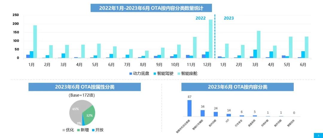 - 2023 年 6 月,行业共计更新 323 项功能,相较上月有所上升,上升幅度最大的依然是智能车机及仪表,蔚来更新内容多达 129 项。