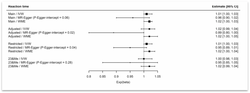 而海马体作为在记忆中起着至关重要作用的大脑结构,研究未发现午睡遗传倾向与其的关联。接下来,研究者进一步探究了午睡与认知功能之间的关系。结果显示,午睡与反应时间或视觉记忆之间没有关联,MR-Egger和WME方法未发现水平多效性的证据。