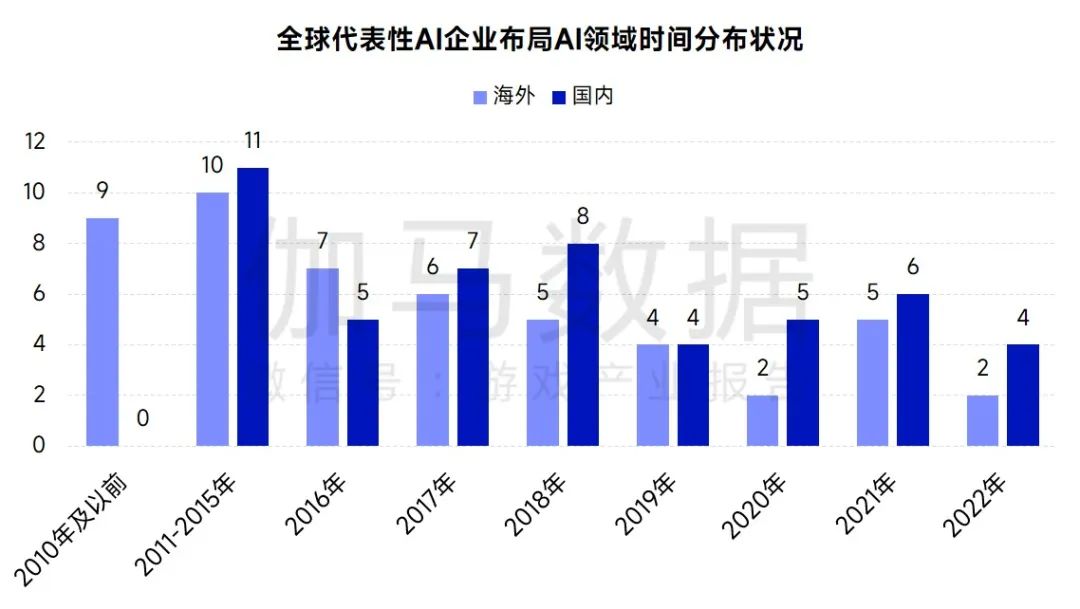 在布局时间方面,中国企业近年来才开始在AI领域进行布局,而海外部分企业最早布局甚至可以追溯到数十年以前。