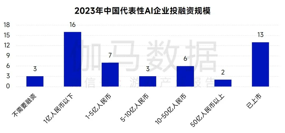 在资本投入方面,中国大量初创性企业投融资规模集中在1亿元人民币以下,而海外代表性AI企业最低投融资规模超过5000万美元。