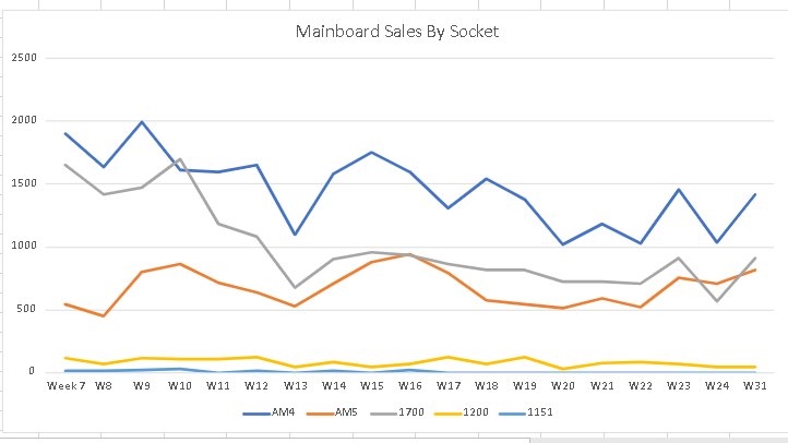 主板方面,AMD也是当仁不让,当周销量2240块,占比达70.22%,Intel平台只卖了950块。