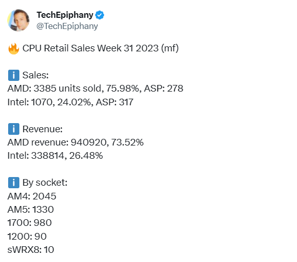 德国最大的零售商MindFactory公布了2023年第31周处理器、主板销量统计。一如既往,德国玩家对AMD的确是真爱。AMD处理器当周卖出3385颗,拿下75.98%的份额,Intel处理器则只有1070颗、24.02%份额,差了超过3倍。