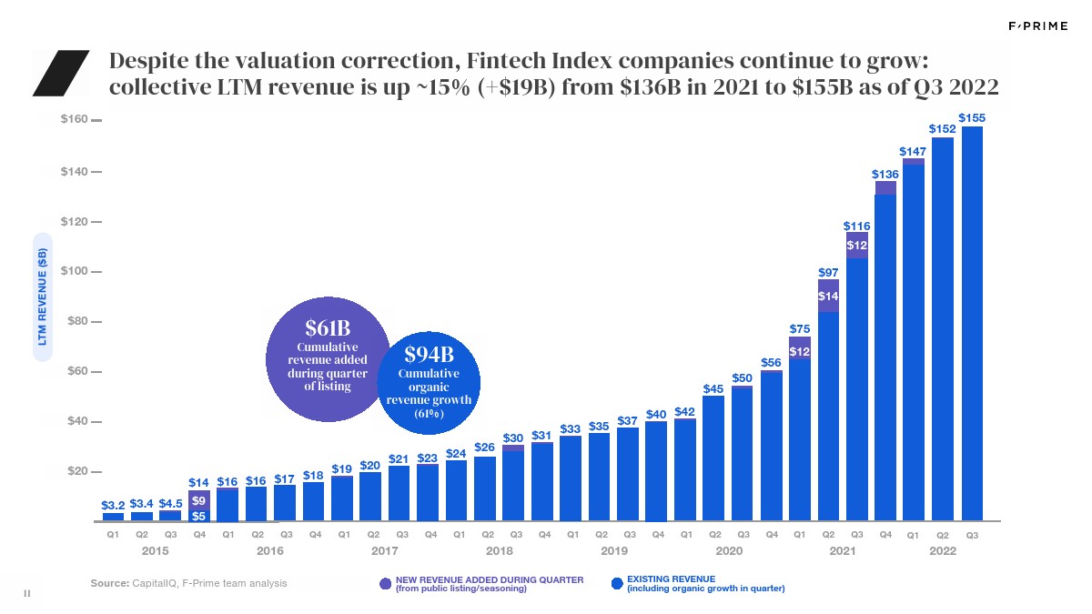 金融科技指数的长期管理收入平均增长48%,仅在2022年前三个季度,总收入就增加了190亿美元(+15%)。