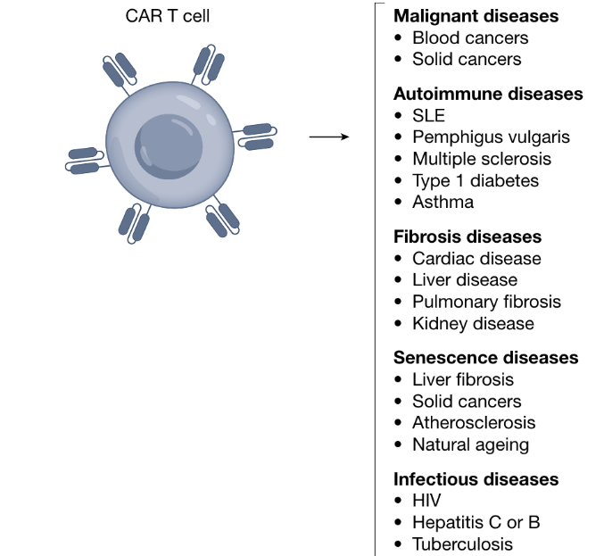 1. Baker DJ, Arany Z, Baur JA, Epstein JA, June CH. CAR T therapy beyond cancer: the evolution of a living drug. Nature. Jul 2023;619(7971):707-715. doi:10.1038/s41586-023-06243-w