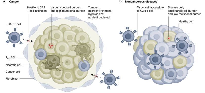 图3. CAR-T疗法在癌症与其他疾病中的区别[1]