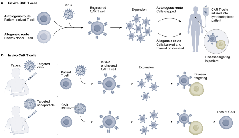 图4. 传统离体制备CAR-T与新兴体内制备CAR-T的区别[1]