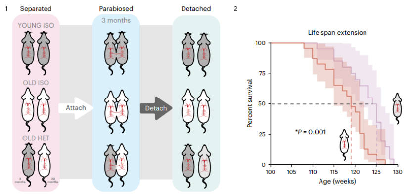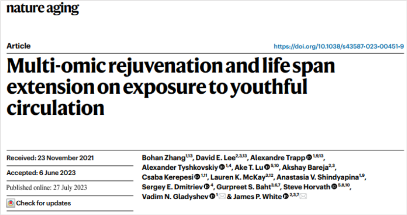 2023年7月27日,杜克大学、哈佛大学医学院以及抗衰老研究公司Altos Labs的研究人员合作,在Nature子刊Nature Aging上发表了题为:Multi-omic rejuvenation and life span extension on exposure to youthful circulation的研究论文,这项研究结果显示,通过手术连接年轻和老年小鼠循环系统的过程减缓了细胞水平的衰老过程,也即是说年轻的血液能够延缓衰老,并将老年动物的寿命延长了多达10%。