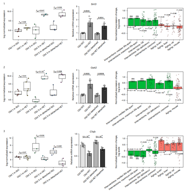 为了揭示在长期联体共生中观察到的年轻化效应可能的机制,研究人员还调查了对HPB作出反应的个体基因及其与寿命延长的关联,几个与寿命调节有关的基因被发现,包括Gstt2、Sirt3、C1qb和Tert,这些基因在长期共生后显示出持续的表达变化。值得重视的是,与短期(5周)联体共生相比,长期(3个月)联体共生对小鼠的转录组和表观基因组的年轻化效果更加显著。这种长效的年轻化效果使老年小鼠的健康时期和寿命得到延长,即使经历了这种创伤性手术,还能产生介于年轻和老年小鼠之间的分子特征(图四)。