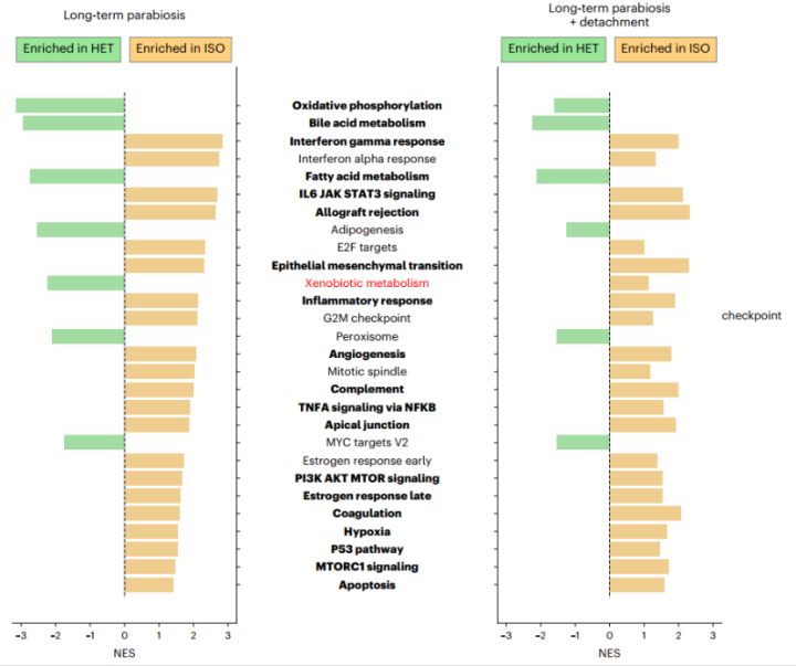 鉴于显著的表观遗传年龄逆转,作者希望同时阐明联体共生对转录组的影响。对共生连接小鼠的肝脏组织进行了RNA-seq分析,然后进行差异基因表达和基因集富集分析(GSEA)后发现,在联体连接期后立即采集的样本中,观察到三羧酸循环、氧化磷酸化、线粒体生物合成和脂肪酸代谢通路呈现积极富集,同时干扰素γ和炎症反应通路则呈现耗竭(即负富集),这表明HPB可能逆转了关键能量生产途径以及炎症等衰老特征(图三),这些结果进一步支持HPB对小鼠转录组的恢复作用。