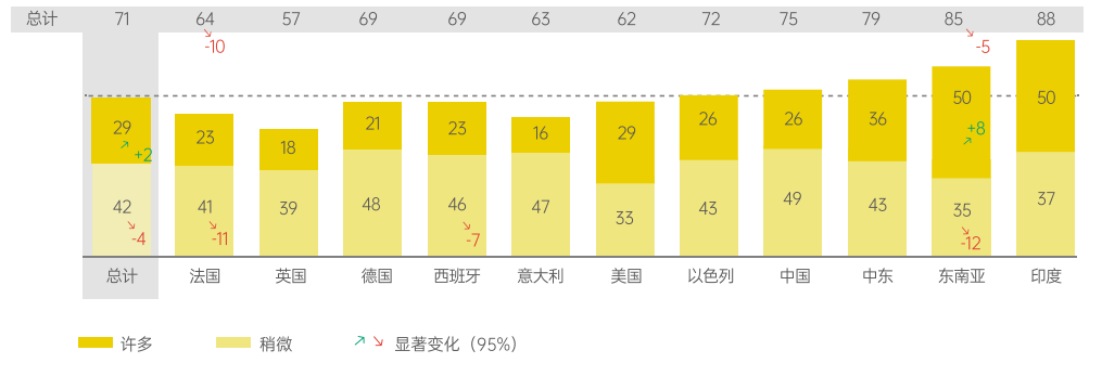 欧洲人的担忧略有缓和,亚洲人的担忧则呈上升趋势(+9个点88%)。