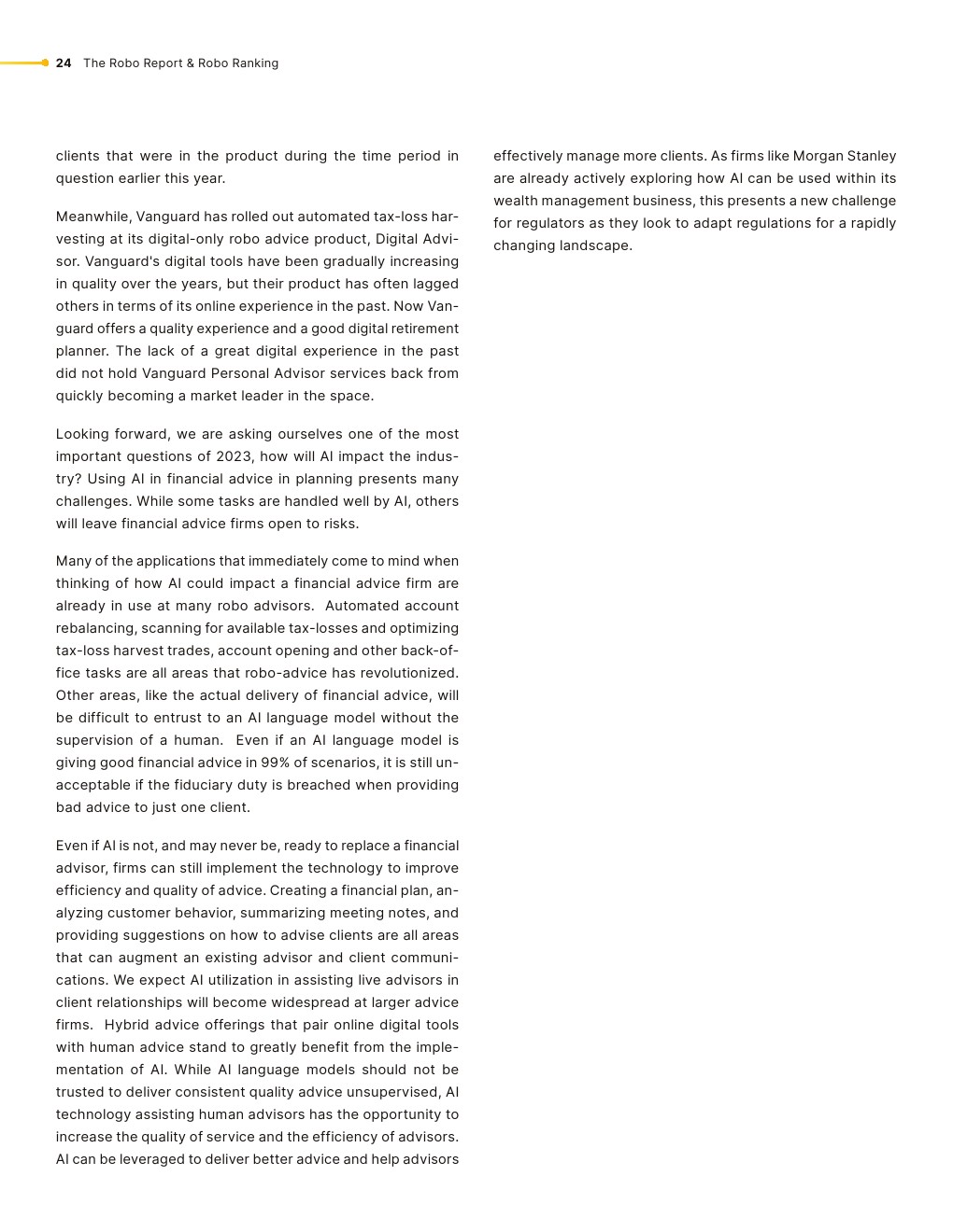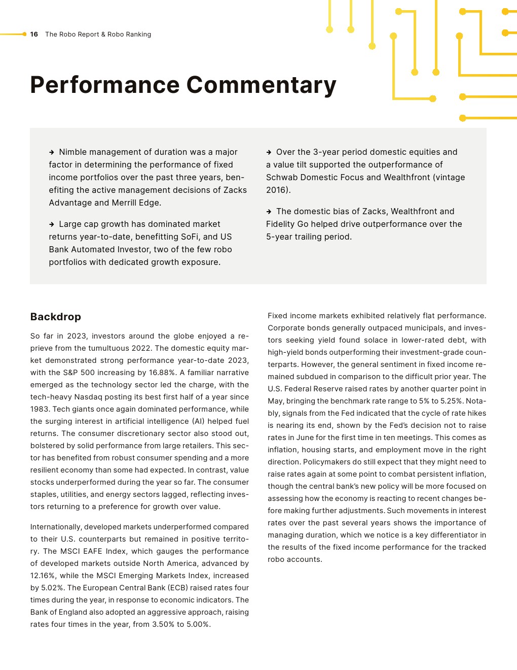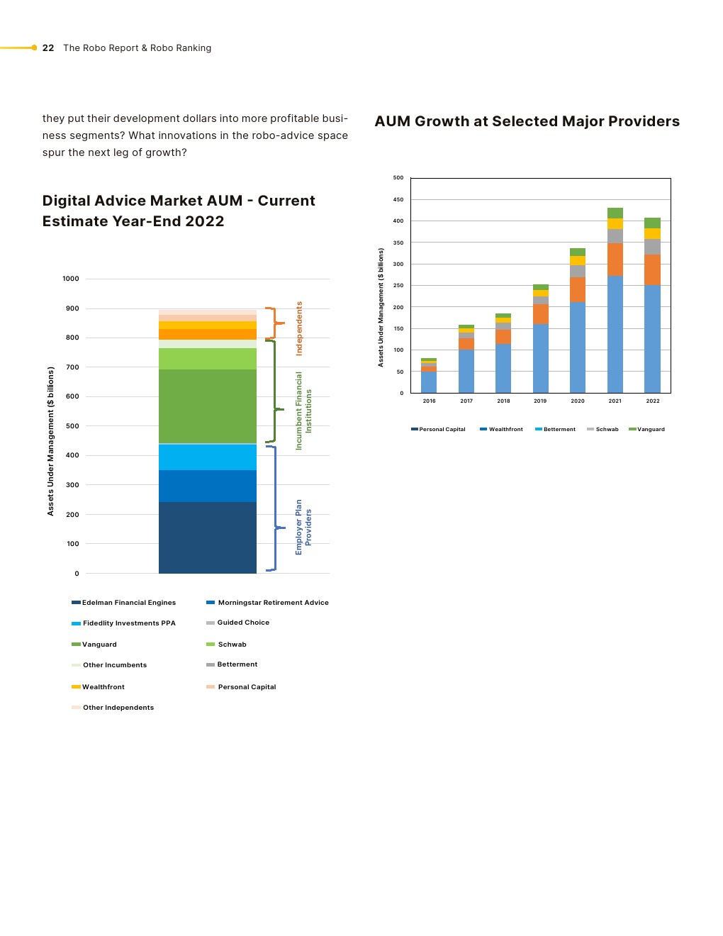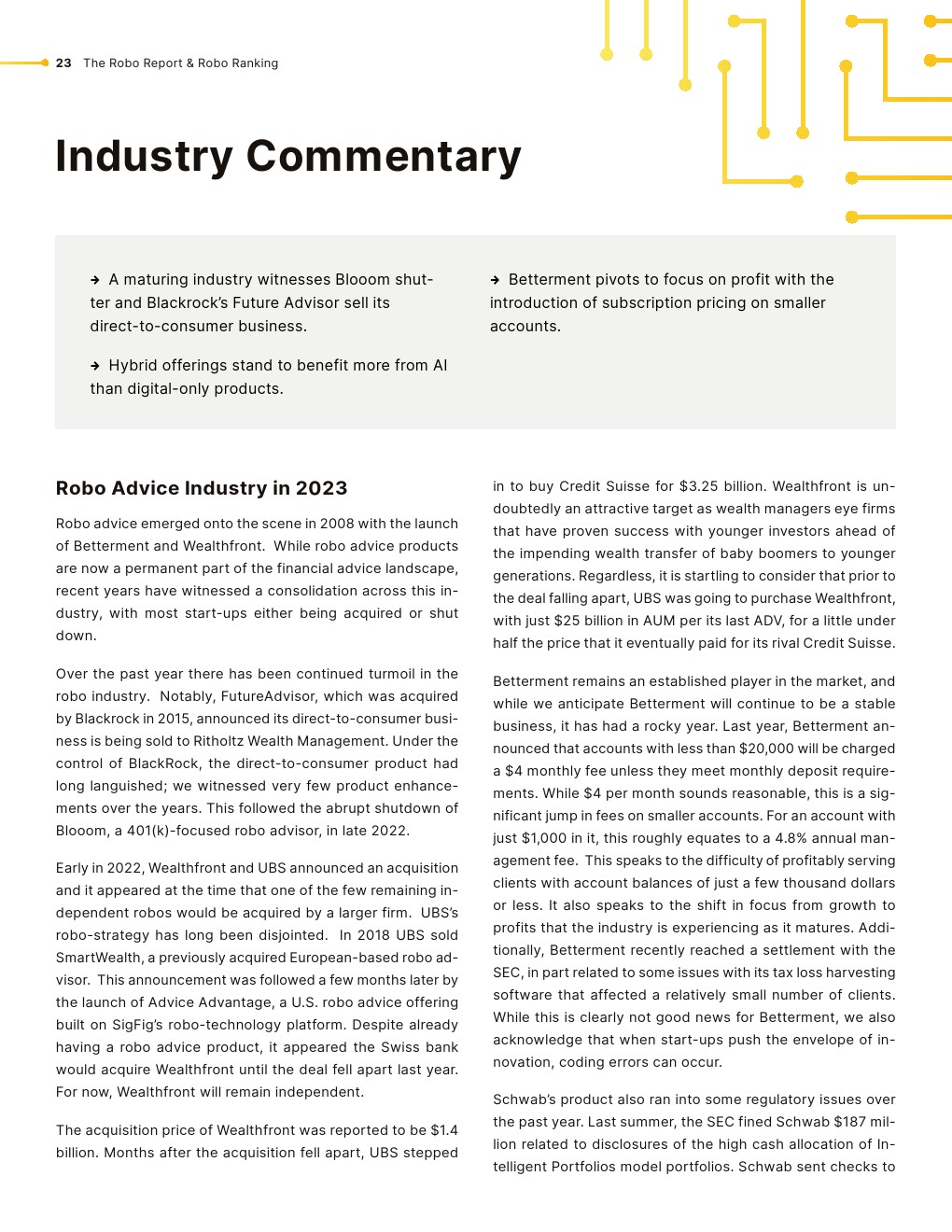 机器人行业经历了剧变。FutureAdvisor自2015年以来一直隶属于贝莱德,目前正在向Ritholtz Wealth Management过渡。以401(k)为中心的机器人顾问bloom于2022年关闭。瑞银在2022年以14亿美元收购Wealthfront的意外尝试失败了,导致他们以32.5亿美元收购了瑞士信贷。