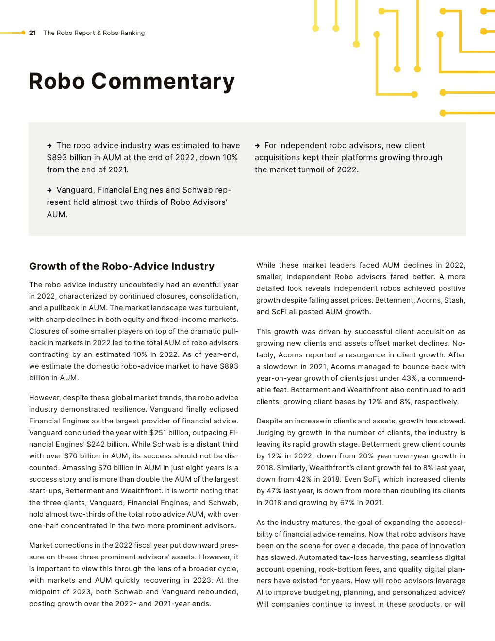 Betterment遇到了挑战,对较小的账户收取每月4美元的费用,并就软件问题与美国证券交易委员会达成和解。嘉信理财因披露现金配置信息而被SEC罚款1.87亿美元,此后对客户进行了赔偿。先锋集团改进了其数字顾问服务,反驳了过去的批评,巩固了其领先地位。
