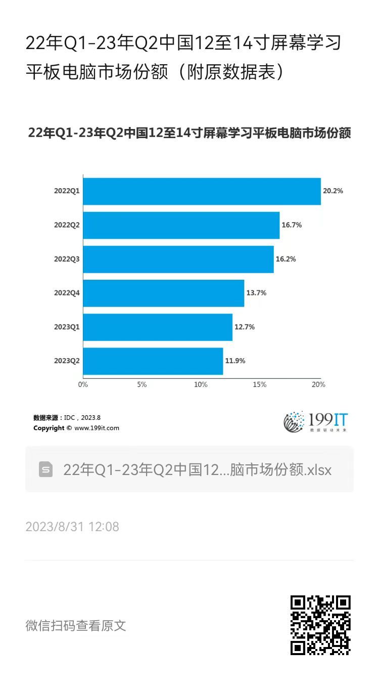 - 22年Q1-23年Q2中国大于15寸屏幕学习平板电脑市场份额(附原数据表)