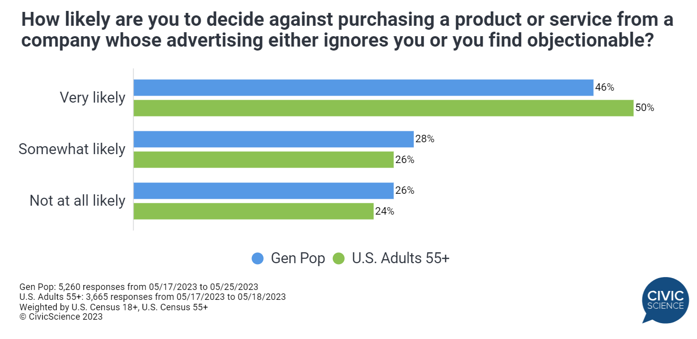 55岁以上的美国人不仅更有可能觉得自己在广告中被歪曲了,而且他们也更有可能拒绝那些忽视或以令人反感的方式描绘产品或服务的广告。55岁及以上的成年人在这种情况下“很有可能”决定不购买某种产品的可能性比普通大众(50%比46%)高4个百分点,而他们至少“有点可能”会这样做的可能性略高。