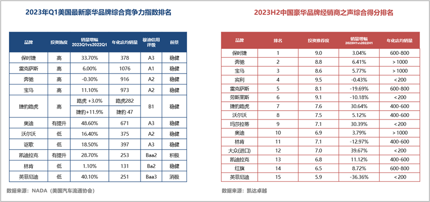 凯达卓越每年两次发布《中国汽车经销商之声调研报告》,最近一期2023H2调研报告显示:经销商评价排名前5名的豪华品牌分别是保时捷、奔驰、宝马、宾利、雷克萨斯。正通汽车最核心的豪华品牌是宝马、保时捷,也是经销商评价较高的品牌。由此可见,精准、正确的品牌选择策略为正通汽车带来了很好的经济效益。建议各经销商集团在2023下半年的品牌调整中更多关注该研究结果,快速、有效地完成网络调整。