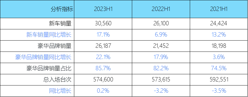 2023年上半年,实现新车销量30,560台,同比上升17.1%,其中豪华品牌销量26,187台,同比上升22.1%,豪华品牌销量占比由2022年的82.2%上升至85.7%;总入厂台次574,600台,同比上升0.2%。