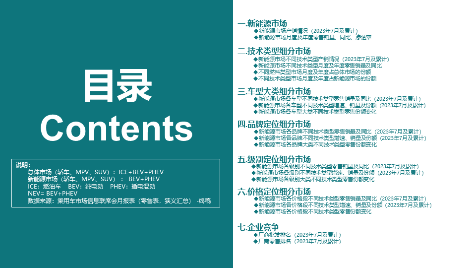 - 新能源市场各品牌不同技术类型增速、销量及份额(2023年7月及累计)