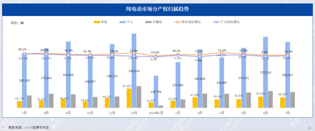 7月,纯电动市场个人用户占比为71.5%;同比增长19.3%;单位用户占比11.2%,同比增长52.3%。