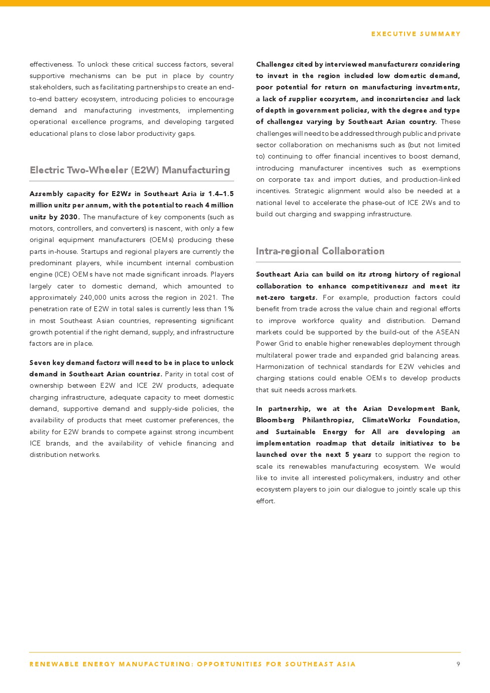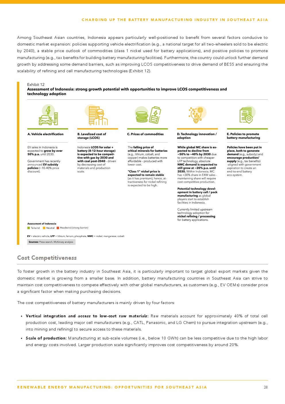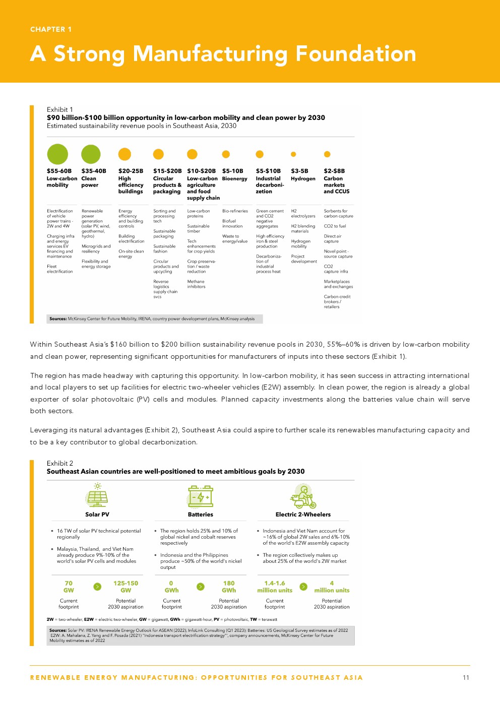 亚洲发展银行发布了“可再生能源制造业——东南亚的机遇”。据估计,到2030年,东南亚的低碳交通和清洁能源行业将有900亿至1000亿美元的收入机会。东南亚已经具备了满足这些行业制成品需求的良好条件,因为它已经生产了全球9%至10%的太阳能光伏(PV)电池和组件,约占全球镍产量的50%,以及目前全球电动两轮车产量的6%至10%。它还拥有支持扩大生产的天然优势:16太瓦的太阳能技术潜力,分别占全球镍和钴储量的25%和10%,以及全球两轮车市场的25%。